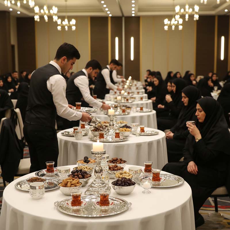 پذیرایی یکی از بخشهای مهم مراسم است که نشاندهنده احترام میزبان به مهمانان است. شرکتهای تشریفاتی معمولاً بسته به نوع مراسم، منوهای متفاوتی ارائه میدهند. از پذیرایی ساده با چای، خرما و حلوا گرفته تا سرو غذاهای گرم و دسر برای مراسمهای بزرگتر. نحوه سرو و نظم در پذیرایی بسیار اهمیت دارد، زیرا این جزئیات کوچک باعث میشود مراسم با نظم و احترام بیشتری برگزار شود و مهمانان احساس راحتی کنند.